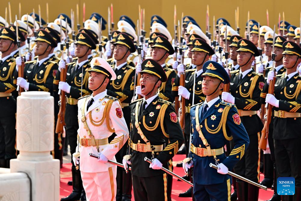Honor guards stand in formation during a grand gathering to mark the 80th anniversary of the victory in the Chinese People's War of Resistance against Japanese Aggression and the World Anti-Fascist War in Beijing, capital of China, Sept. 3, 2025. (Xinhua/Li Xin)