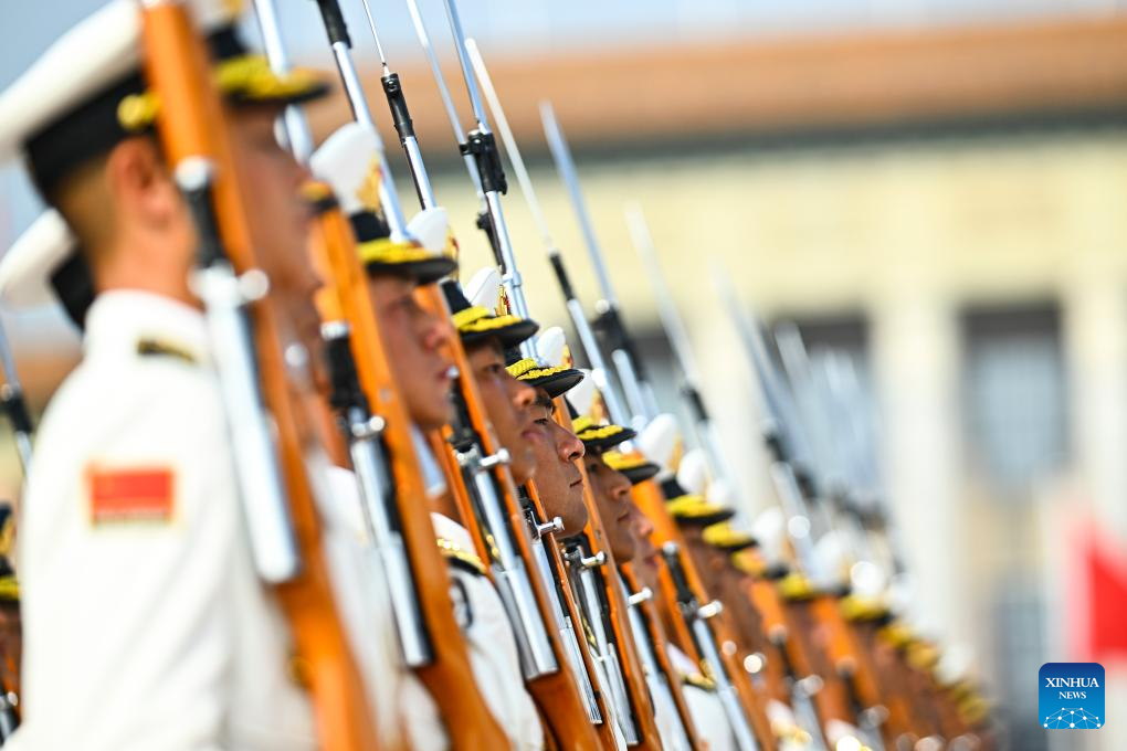 Honor guards stand in formation during a grand gathering to commemorate the 80th anniversary of the victory in the Chinese People's War of Resistance against Japanese Aggression and the World Anti-Fascist War in Beijing, capital of China, Sept. 3, 2025. (Xinhua/Zhang Hongxiang)