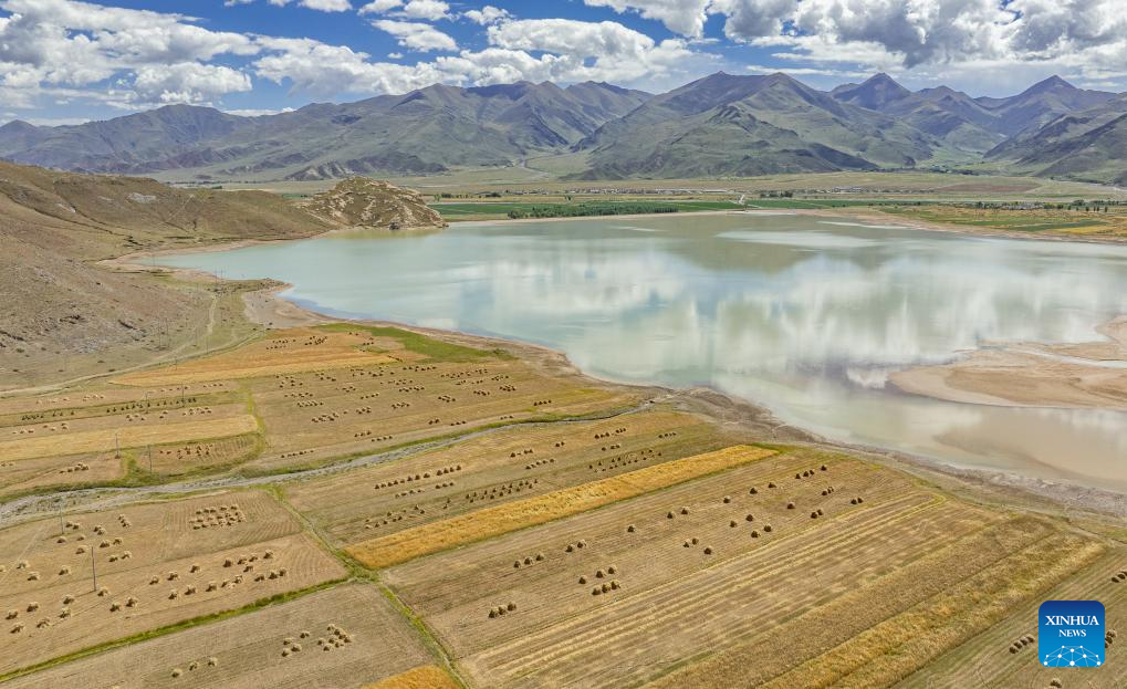 This aerial drone photo taken on Sept. 23, 2025 shows a harvested field of highland barley in Lhunzhub County, in Lhasa, southwest China's Xizang Autonomous Region. The Chinese farmers' harvest festival is the first national festival created specifically for the country's farmers. Starting in 2018, the festival coincides with the Autumnal Equinox each year, which is one of the 24 solar terms of the Chinese lunisolar calendar and usually falls between Sept. 22 and 24 during the country's agricultural harvest season. (Xinhua/Tenzin Nyida)