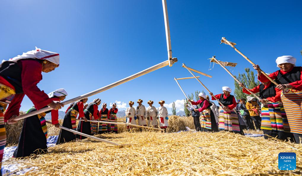Farmers thresh crops in a traditional way in Lhunzhub County, in Lhasa, southwest China's Xizang Autonomous Region, Sept. 23, 2025. The Chinese farmers' harvest festival is the first national festival created specifically for the country's farmers. Starting in 2018, the festival coincides with the Autumnal Equinox each year, which is one of the 24 solar terms of the Chinese lunisolar calendar and usually falls between Sept. 22 and 24 during the country's agricultural harvest season. (Xinhua/Tenzin Nyida)