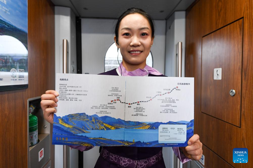 A stewardess shows a commemorative album of Shenyang-Baihe section of the Shenyang-Jiamusi High-Speed Railway on the train G8166 on Sept. 28, 2025. A new high-speed rail link began operation on Sunday, significantly shortening the travel time from China's capital Beijing to the renowned Changbai Mountain in the northeastern province of Jilin, offering a boost to China's growing winter sports and ice tourism market. (Xinhua/Zhang Nan)