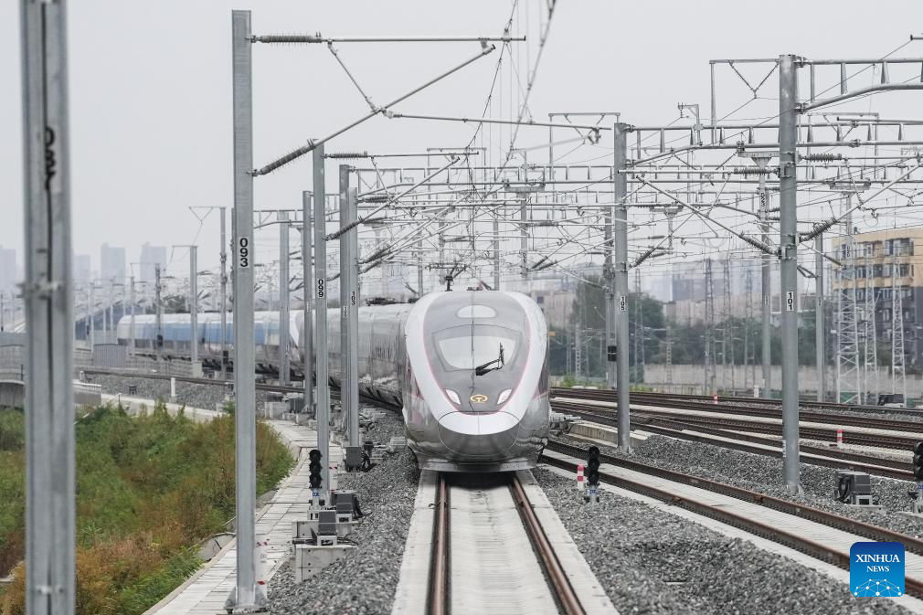 A train bound for Changbaishan Railway Station departs from Fushun, northeast China's Liaoning Province, Sept. 28, 2025. A new high-speed rail link began operation on Sunday, significantly shortening the travel time from China's capital Beijing to the renowned Changbai Mountain in the northeastern province of Jilin, offering a boost to China's growing winter sports and ice tourism market. (Xinhua/Pan Yulong)