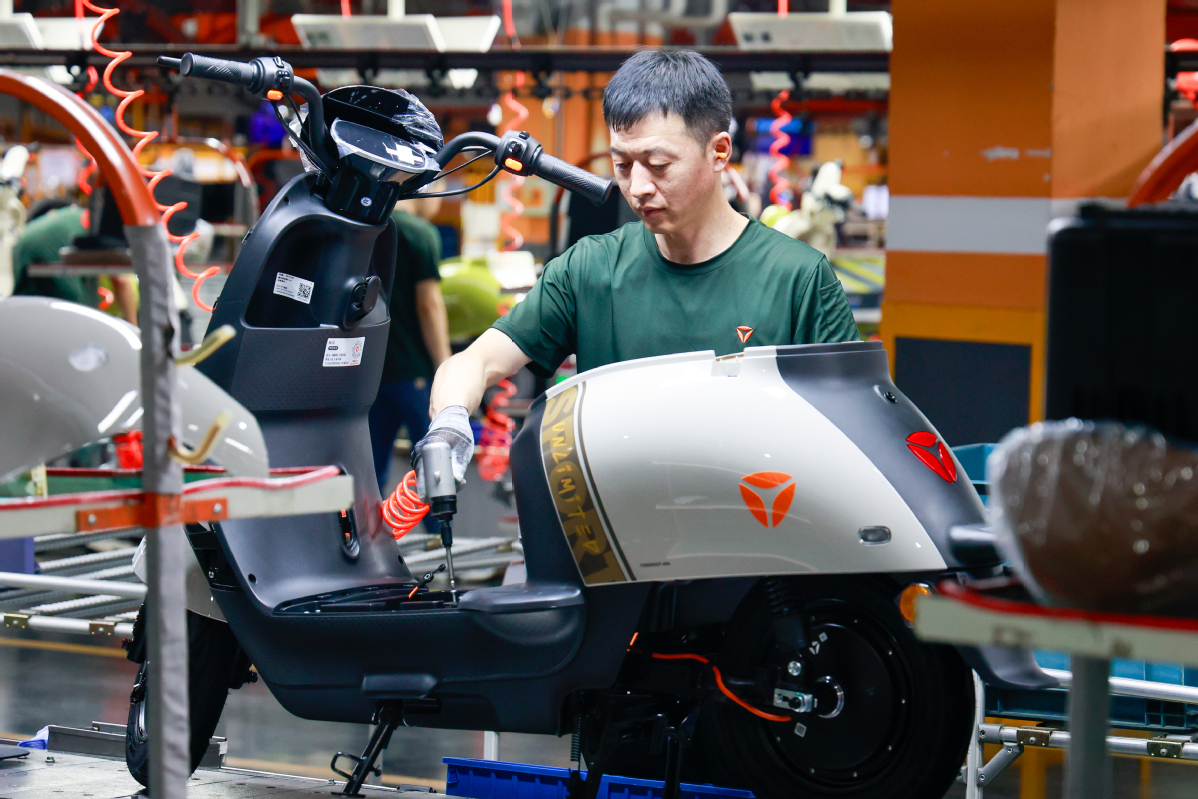 An employee works on the assembly line of Yadea Technology Group Co in Wuxi, Jiangsu province. LIU JIAQI/XINHUA
