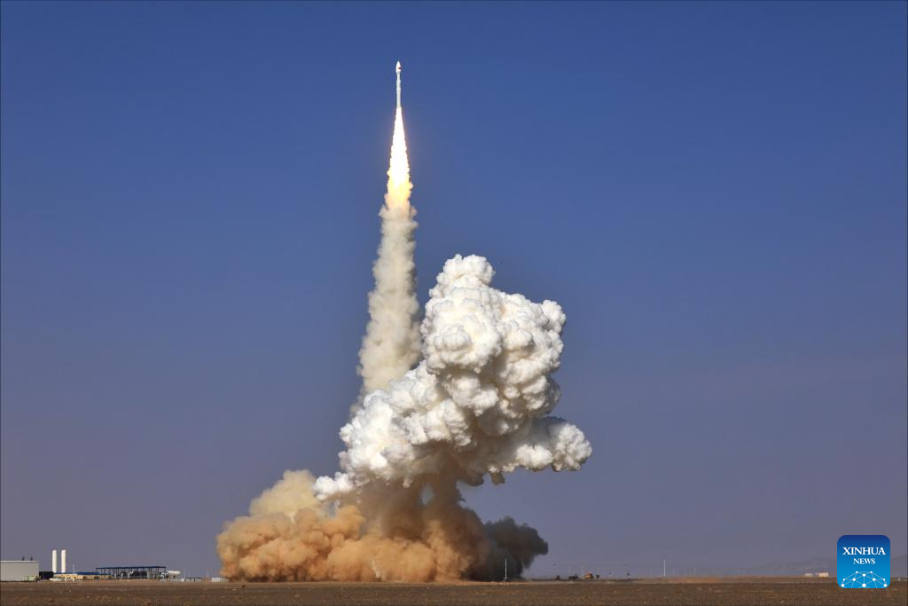 The Lijian-1 Y8 carrier rocket with three satellites blasts off from a commercial aerospace innovation pilot zone in northwest China, Oct. 19, 2025. (Photo by Li Yunxi/Xinhua)