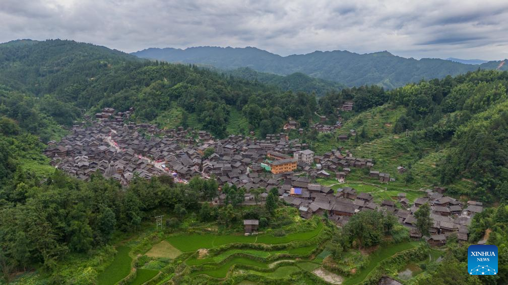 An aerial drone photo taken on July 20, 2024 shows a panoramic view of the Huanggang Village in Qiandongnan Miao and Dong Autonomous Prefecture, southwest China's Guizhou Province. Four Chinese villages were listed in the UN Tourism's 2025 edition of "Best Tourism Villages," according to announcements made at a UN Tourism awards ceremony on Friday in Huzhou, east China's Zhejiang Province. (Photo by Long Jianrui/Xinhua)