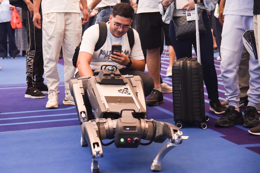 A robotic dog produced by CVTE, which is a high-tech company focused on interactive display and AI, has been widely photographed at the fair. Empowered by the company's self-developed AI algorithms, the robotic dog can climb slopes of up to 35 degrees with ease, and can operate smoothly on grass, gravel and sand surfaces.