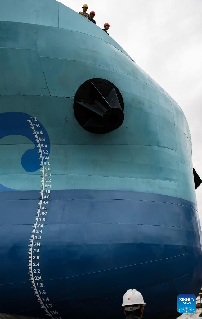 Workers are seen at the construction site of the all-electric bulk carrier Gezhouba in Yichang, central China's Hubei Province, Oct. 19, 2025. (Photo by Zheng Jiayu/Xinhua)