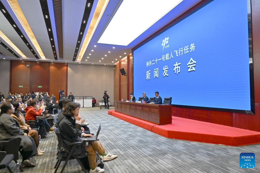 A press conference on the Shenzhou-21 crewed spaceflight mission is held in Jiuquan Satellite Launch Center in northwest China on Oct. 30, 2025. (Xinhua/Li Zhipeng)