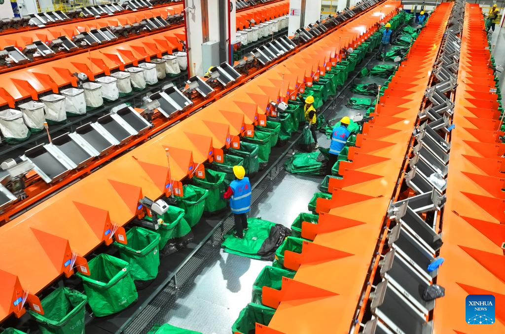 This drone photo taken on Nov. 11, 2025 shows staff members sorting parcels at a branch of China Post in Hengyang City, central China's Hunan Province. E-commerce and logistics companies across China are working at full capacity during the annual "Double Eleven" shopping festival. (Photo by Cao Zhengping/Xinhua)
