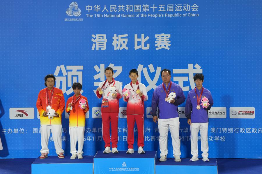 Zou Mingke of Guangdong in action during the women's skateboarding park final at China's 15th National Games in Huizhou, south China's Guangdong Province, Nov. 11, 2025. (Xinhua/Lu Hanxin)