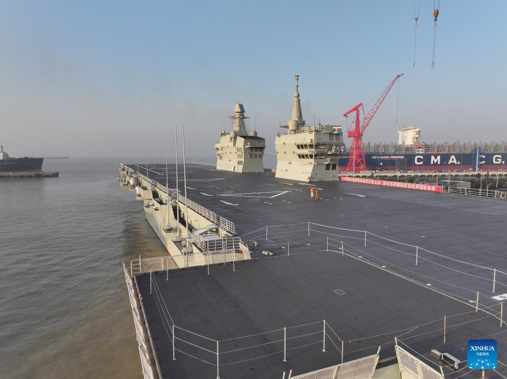 China's first Type 076 amphibious assault ship, PLANS Sichuan, sets sail from the port of Hudong-Zhonghua Shipbuilding (Group) Co., Ltd. in east China's Shanghai, Nov. 14, 2025. (Photo by Zhang Liang/Xinhua)