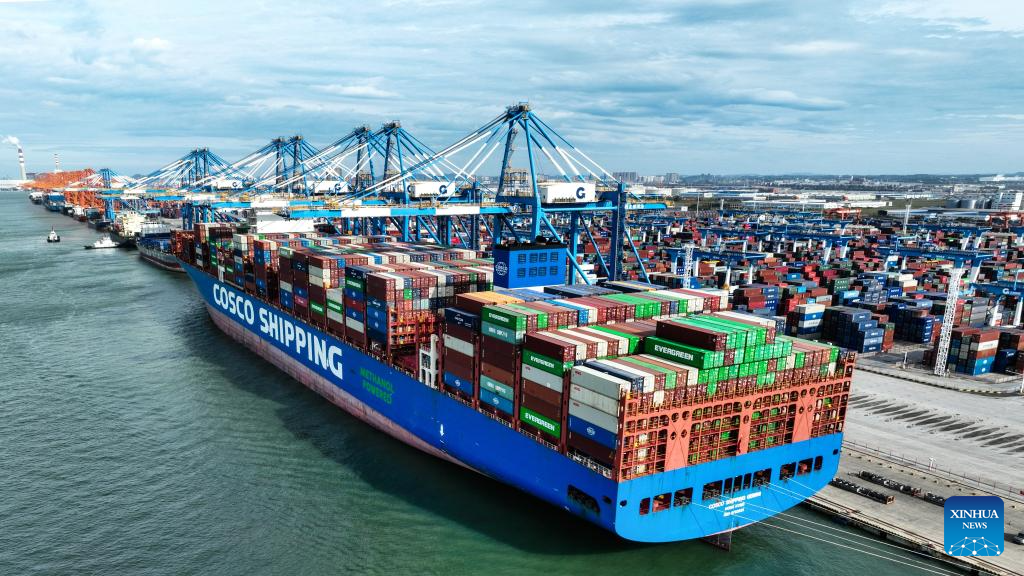 A drone photo taken on Nov. 11, 2025 shows a vessel unloading cargo at the Qinzhou Port in Qinzhou City, south China's Guangxi Zhuang Autonomous Region. The New International Land-Sea Trade Corridor (ILSTC), a key logistics route connecting western China to global markets, had transported a cumulative total of more than 5 million twenty-foot equivalent units (TEUs) of cargo as of Saturday, according to China Railway Nanning Group Co., Ltd. (Xinhua/Zhang Ailin)