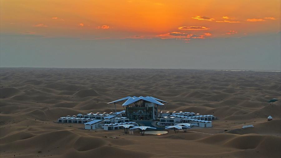 This aerial photo taken on Sept. 6, 2023 shows Desert Star Hotel in Shapotou District of Zhongwei City, northwest China's Ningxia Hui Autonomous Region. (Xinhua/Wang Peng)