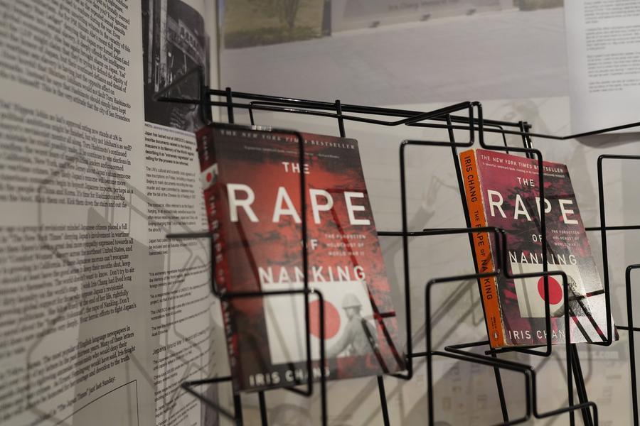 Two books of Iris Chang's "The Rape of Nanking: The Forgotten Holocaust of World War II" are displayed at a reading room of the San Francisco WWII Pacific War Memorial Hall in San Francisco, the United States, Aug. 20, 2022. (Xinhua/Wu Xiaoling)