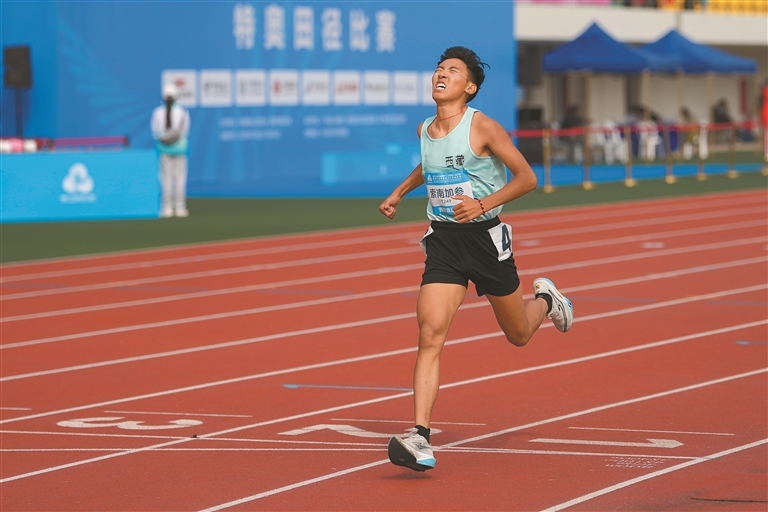 Sonam Gyaltsen crosses the finish line first in the men's 800 meters for athletes aged 16 to 21 at China's 12th National Games for Persons with Disabilities and the 9th National Special Olympic Games in Zhongshan, southern China's Guangdong province, Dec. 11, 2025. [Photo/Xinhua]