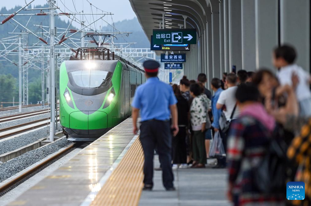 A train arrives at Peng'an West Station of Bazhong-Nanchong high-speed railway in Peng'an County of Nanchong City, southwest China's Sichuan Province, June 27, 2024. The high-speed railway connecting Sichuan's Bazhong and Nanchong cities was open to operation on the same day. China, home to the world's largest high-speed rail network, has expanded its total operational mileage beyond 50,000 kilometers with the launch of a new high-speed line.