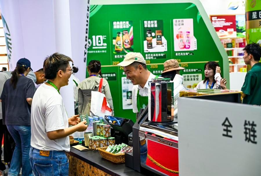 A visitor learns about products at the booth of Starbucks in the Healthy Life Chain area of the third China International Supply Chain Expo (CISCE) in Beijing, capital of China, July 19, 2025. (Xinhua/Chen Shuo)