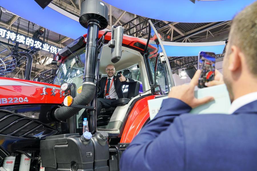 A visitor poses for photos with a tractor at the booth of China National Machinery Industry Corporation (Sinomach) in the Green Agriculture Chain area of the third China International Supply Chain Expo (CISCE) in Beijing, capital of China, July 16, 2025. (Xinhua/Wang Jingyi)