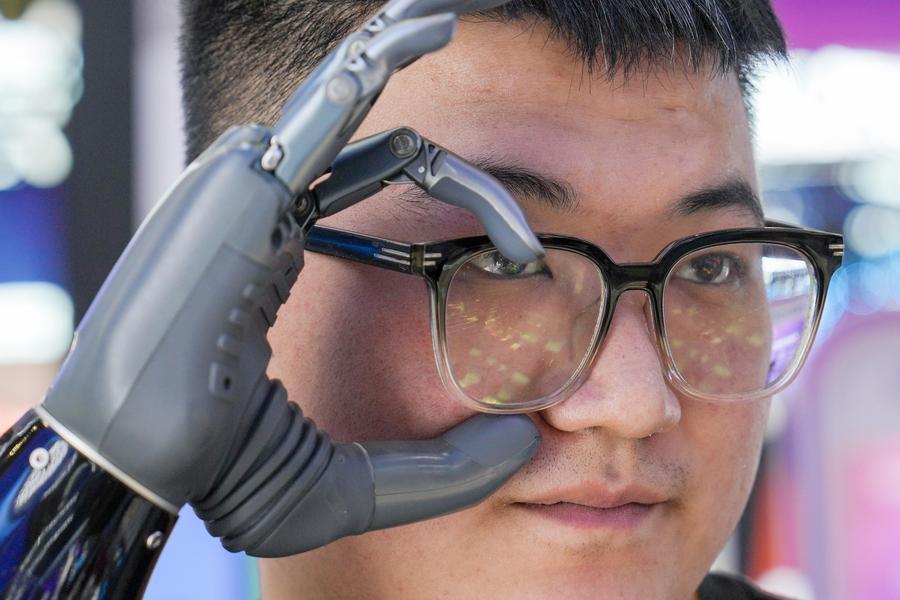 A staff member of technology firm BrainCo uses a smart prosthetic hand to take off his glasses in the Digital Technology Chain area of the third China International Supply Chain Expo (CISCE) in Beijing, capital of China, July 17, 2025. (Xinhua/Ju Huanzong)