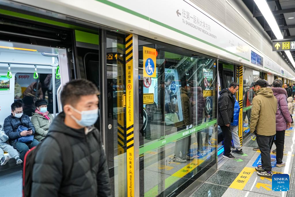 Citizens board and get off a train of Jinan Subway Line 4, in Jinan, east China's Shandong Province, Dec. 27, 2025. China's first subway line passing through a karst spring area began operation on Saturday in Jinan, marking an engineering breakthrough that balances urban transit demands with the protection of natural water resources. Jinan Subway Line 8 and the east section of Jinan Subway Line 6 started operation on the same day, increasing the city's total rail transit mileage to 248 kilometers. (Xinhua/Zhu Zheng)