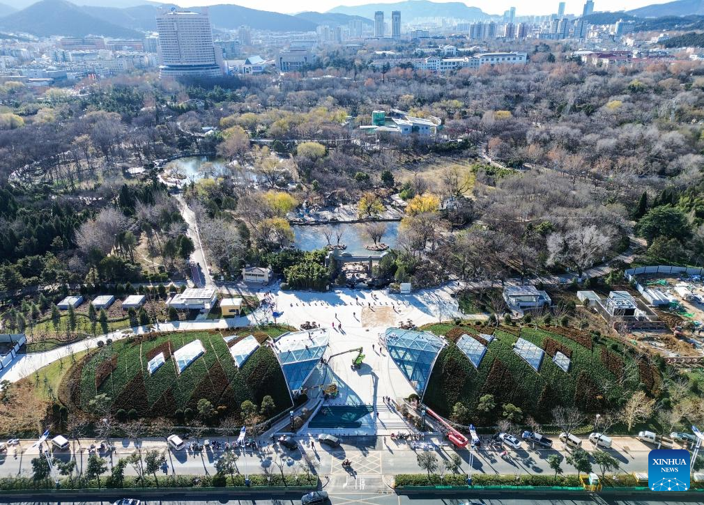 This aerial drone photo taken on Dec. 25, 2025 shows the Quancheng Park Station of Jinan Subway Line 4, in Jinan, east China's Shandong Province. China's first subway line passing through a karst spring area began operation on Saturday in Jinan, marking an engineering breakthrough that balances urban transit demands with the protection of natural water resources. Jinan Subway Line 8 and the east section of Jinan Subway Line 6 started operation on the same day, increasing the city's total rail transit mileage to 248 kilometers. (Xinhua/Zhu Zheng)