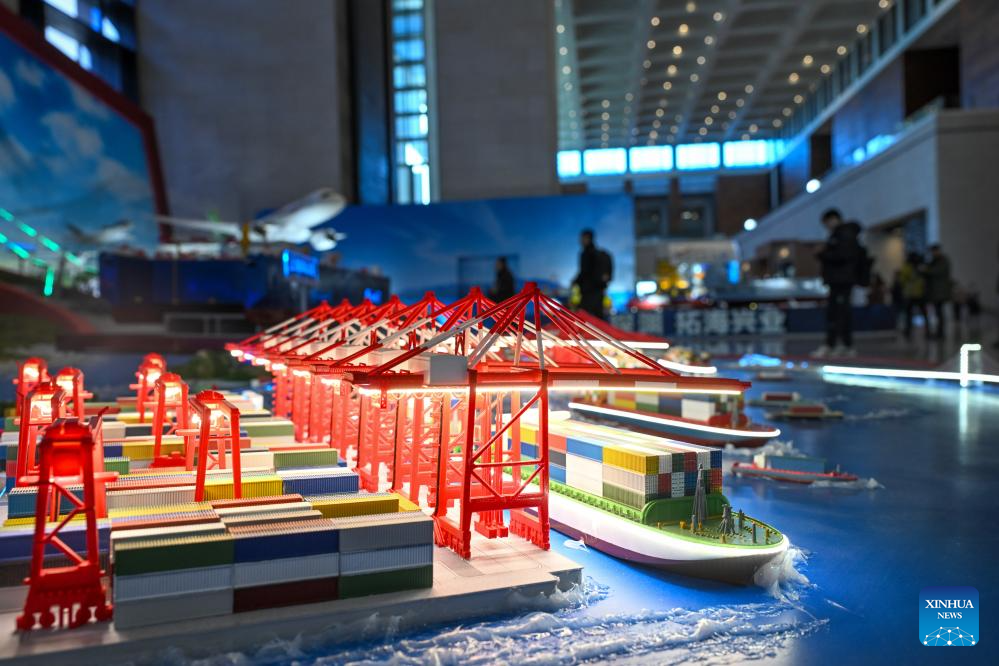 This photo taken on Dec. 29, 2025 shows a model of Shanghai's Yangshan Port at the exhibition "Forging the Path to National Strength: China's Manufacturing Achievements under the 14th Five-Year Plan" at the National Museum of China in Beijing, capital of China. With more than 300 pieces (sets) exhibits, the exhibition kicked off here on Monday, showcasing China's manufacturing achievements under the 14th Five-Year Plan. (Xinhua/Jin Liangkuai)