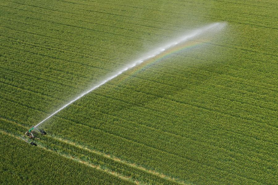 An aerial drone photo taken on May 7, 2025 shows a self-propelled irrigation machine operating in a wheat field in Nanhan Village of Wenxian County, Jiaozuo City, central China's Henan Province. (Photo by Xu Hongxing/Xinhua)