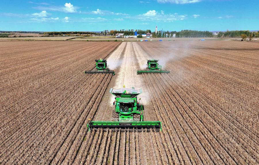 An aerial drone photo shows harvesters working at a soybean field of a farming company under Beidahuang Group in northeast China's Heilongjiang Province, Sept. 29, 2025. (Photo by Lu Wenxiang/Xinhua)