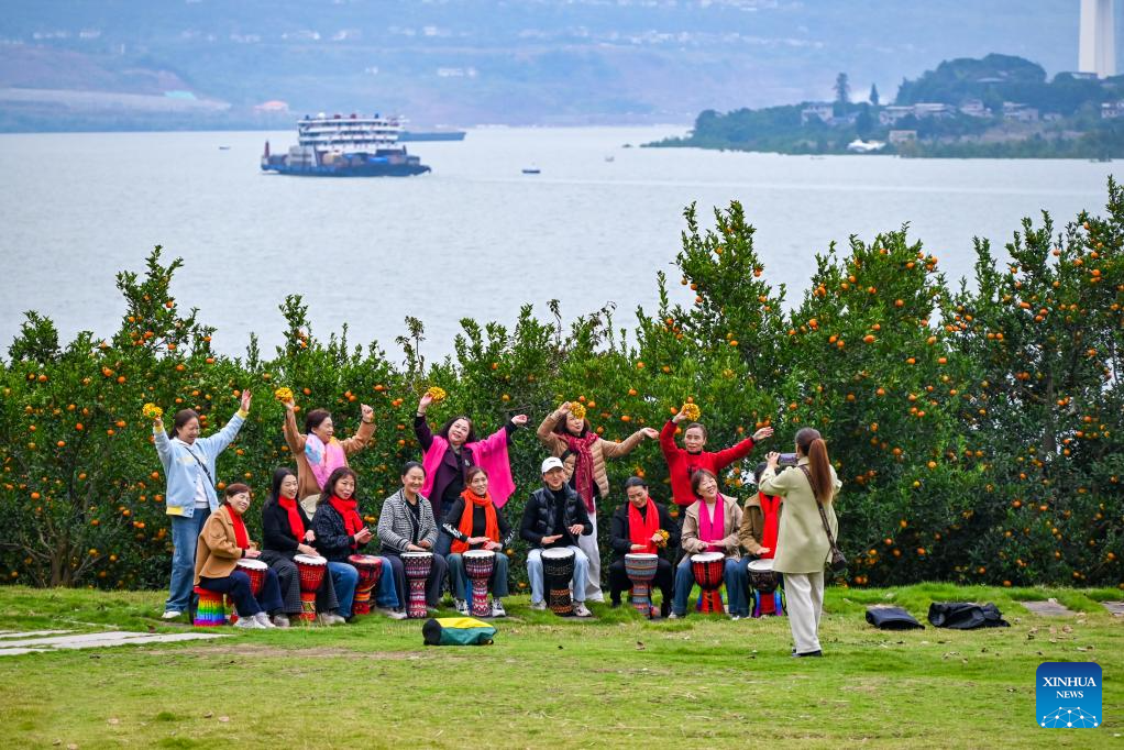 Tourists take photos at a tourism area along the Yangtze River in Wanzhou District of Chongqing, southwest China, Nov. 14, 2025. Acting as a crucial ecological gateway for the upper reaches of the Yangtze River, Chongqing has intensified its environmental protection efforts in recent years.