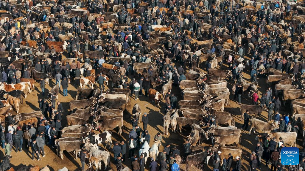 A drone photo taken on Dec. 3, 2025 shows a view of the cattle trading area of Huanggong Bazaar, Xinjiang's largest livestock market, in northwest China's Xinjiang Uygur Autonomous Region. (Xinhua/Hu Huhu)