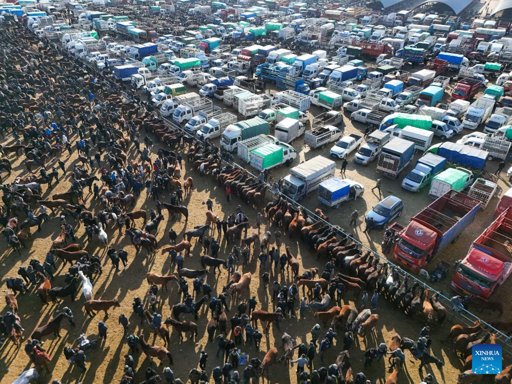An aerial drone photo taken on Dec. 3, 2025 shows a view of the horse trading area of Huanggong Bazaar, Xinjiang's largest livestock market, in northwest China's Xinjiang Uygur Autonomous Region. (Xinhua/Hu Huhu)