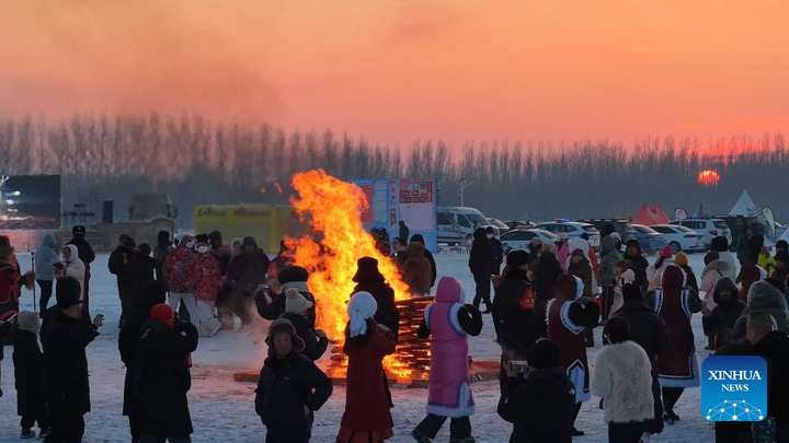 Tourists sing and dance during the 4th Northeast Camping Carnival in Hala village in the Meilisi Daur Ethnic District of Qiqihar, northeast China's Heilongjiang Province, Jan. 13, 2026. (Photo by Wu Han/Xinhua)