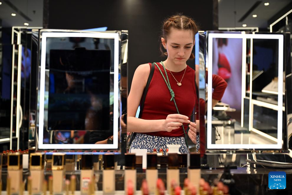 A customer shops at the Sanya International Duty Free City in Sanya, south China's Hainan Province, on Jan. 10, 2026. On Dec. 18 last year, China launched island-wide special customs operations in the Hainan Free Trade Port (FTP), allowing freer entry of overseas goods, expanding zero-tariff coverage, and introducing more business-friendly measures.(Xinhua/Guo Cheng)