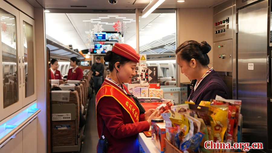 Train attendants arrange goods at the onboard service counter on the Beijing-Harbin HSR train in Beijing, Jan. 22, 2026. [Photo by Zhang Yuxin/China.org.cn]
