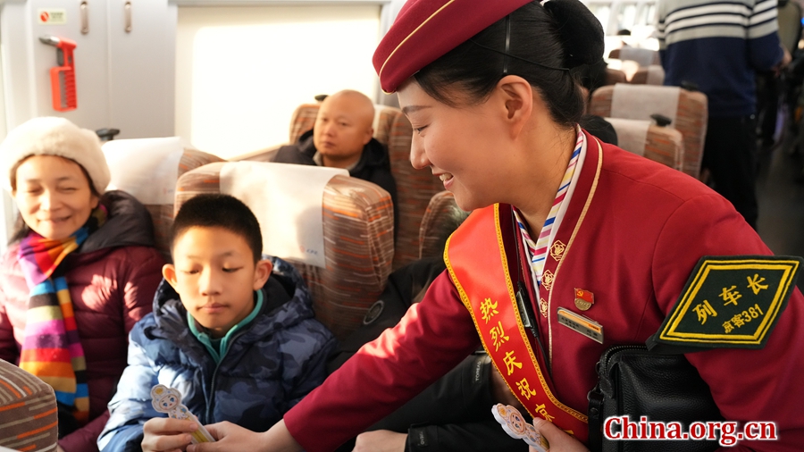 A train attendant gives a Beijing-Harbin HSR mascot to a young passenger on a train to Chengde, Hebei province, Jan. 22, 2026. [Photo by Zhang Yuxin/China.org.cn]