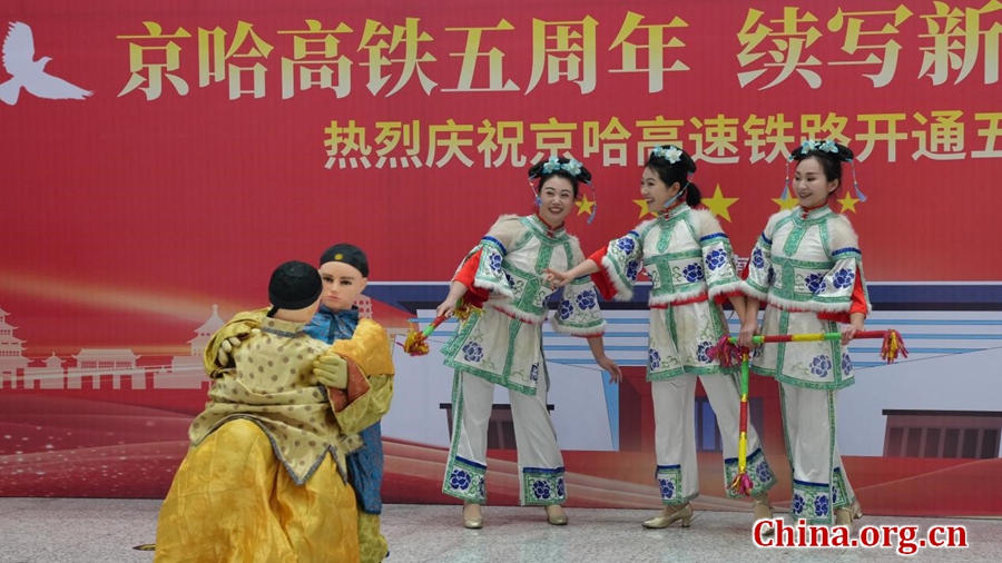 Performers present local intangible cultural heritage to mark the fifth anniversary of the opening of the Beijing-Harbin HSR at Chengdenan Railway Station in Chengde, Hebei province, Jan. 22, 2026. [Photo by Zhang Yuxin/China.org.cn]