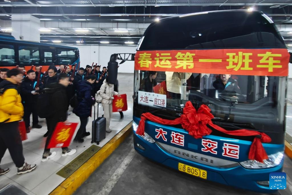 Passengers board a coach at a bus station in Dalian, northeast China's Liaoning Province, Feb. 2, 2026. (Photo by Liu Debin/Xinhua)