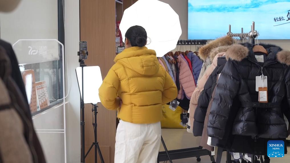 A staff member promotes down jackets via livestreaming at a store in Guigang City, south China's Guangxi Zhuang Autonomous Region, Jan. 4, 2026. (Xinhua/Qin Guanghua)