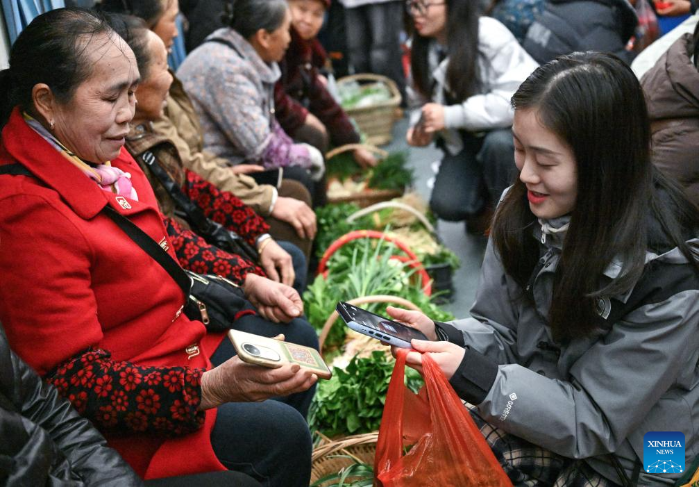 Villagers sell their vegetables on the train No. 5640 in southwest China's Guizhou Province on Feb. 8, 2026. The train No. 5640 runs in Guizhou Province between Yuping Dong Autonomous County of Tongren City and provincial capital Guiyang City. It connects more than 100 ethnic minority villages along the route and makes travel more convenient for the villagers. A New Year market has been introduced on the train No. 5640 upon the upcoming Chinese New Year, during which fresh agricultural products and folk customs were displayed for passengers along the way. (Xinhua/Yang Wenbin)