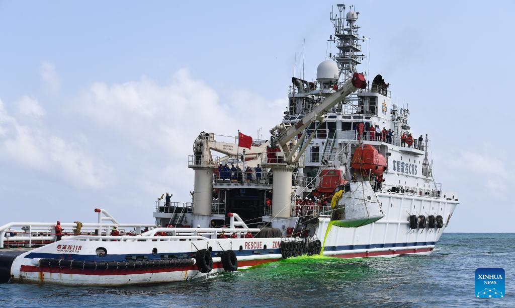 A rescue ship lifts the return capsule of China's new-generation Mengzhou crewed spaceship, Feb. 11, 2026. A low-altitude demonstration and verification flight test for the Long March-10 carrier rocket and a maximum dynamic pressure abort flight test for the new-generation crewed spaceship system Mengzhou are successfully conducted at the Wenchang Spacecraft Launch Site in south China's Hainan Province on Wednesday. (Xinhua/Yang Guanyu)