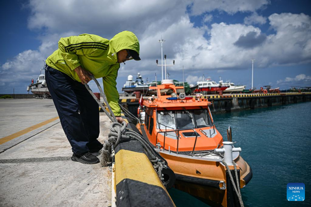 A staff member fixes a maritime transport support vessel at the dock of Yongxing Island of Sansha, south China's Hainan Province, March 19, 2026. On Jan. 7, 2025, maritime transport support vessels were officially put into operation for routes between Yongxing Island and Zhaoshu Island.