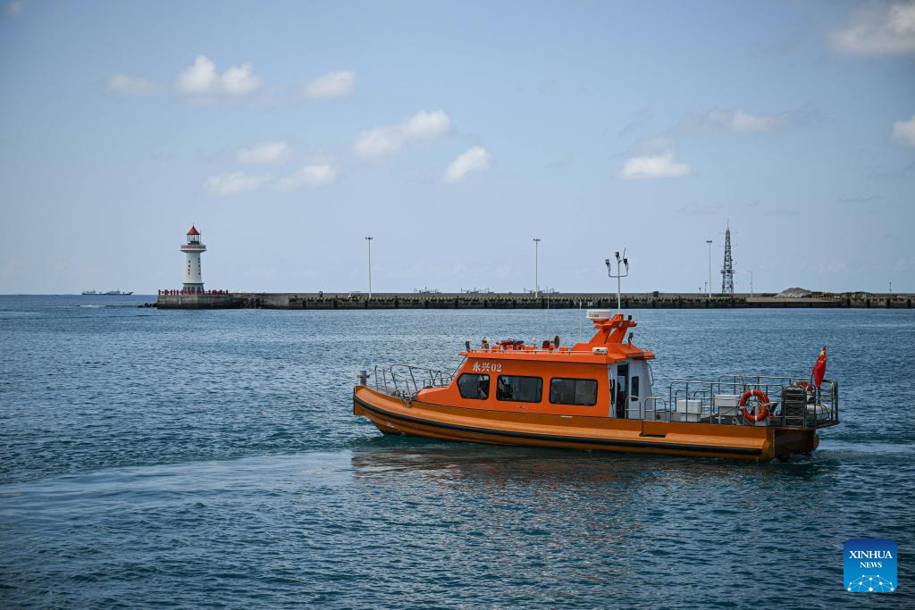 A maritime transport support vessel sets sail from Yongxing Island towards Zhaoshu Island of Sansha, south China's Hainan Province, March 19, 2026. On Jan. 7, 2025, maritime transport support vessels were officially put into operation for routes between Yongxing Island and Zhaoshu Island.