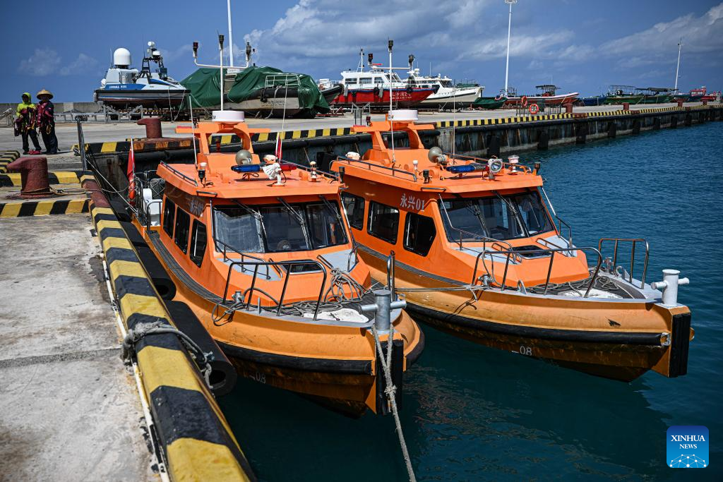 This photo taken on March 20, 2026 shows maritime transport support vessels berthing at the dock of Yongxing Island of Sansha, south China's Hainan Province. On Jan. 7, 2025, maritime transport support vessels were officially put into operation for routes between Yongxing Island and Zhaoshu Island.