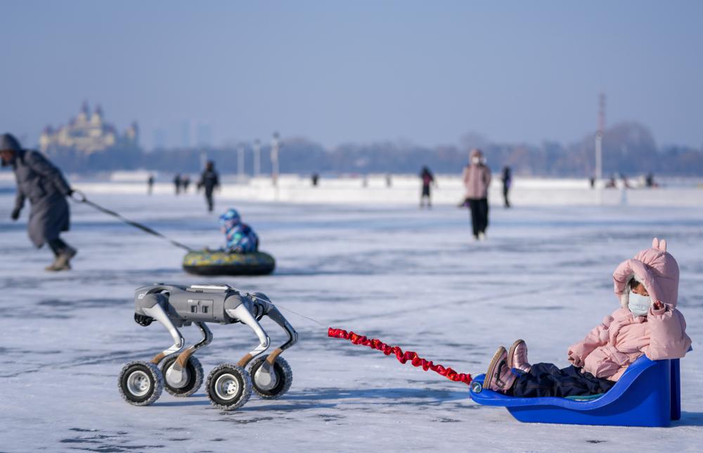 A child rides sled pulled by a robotic dog on the frozen surface of the Songhua River in Harbin, northeast China's Heilongjiang Province, Jan. 11, 2026. (Xinhua/Wang Jianwei)