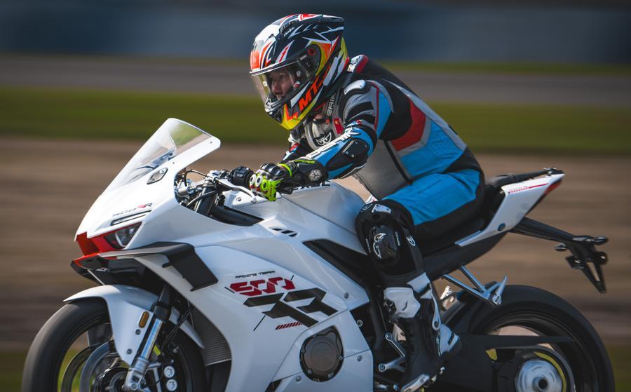 Zhang Xue test-drives a motorcycle at Zhuhai International Circuit in Zhuhai, south China's Guangdong Province, on Jan. 16, 2025. (Xinhua)