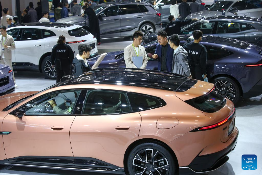 People visit an auto show in Jinan, east China's Shandong Province, April 10, 2026. China's automobile production and sales rose sharply in March from the previous month, industry data showed on Friday. (Photo by Hao Xincheng/Xinhua)