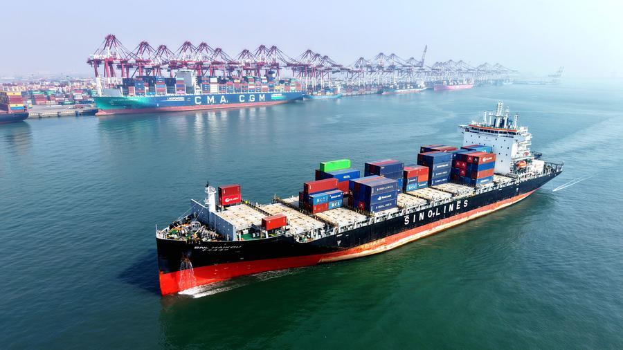 A drone photo taken on April 1, 2026 shows a container ship arriving at the Qingdao Port in Qingdao, east China's Shandong Province. (Photo by Yu Fangping/Xinhua)