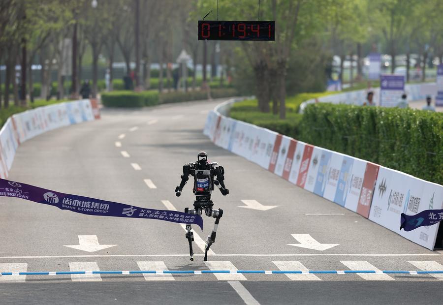 Humanoid robot "Unitree H1" of Hang S Sai Team in the autonomous category crosses the finish line during the Beijing E-Town half-marathon and humanoid robots half-marathon in the Beijing Economic-Technological Development Area in southeast Beijing, China, April 19, 2026. (Xinhua/Zhang Chenlin)