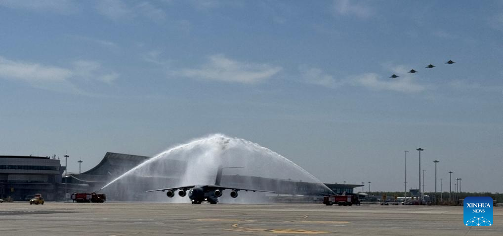 A Chinese Air Force Y-20B large transport aircraft carrying the remains of the fallen soldiers arrives at Taoxian International Airport in Shenyang, northeast China's Liaoning Province, April 22, 2026. (Xinhua/Li Gang)
