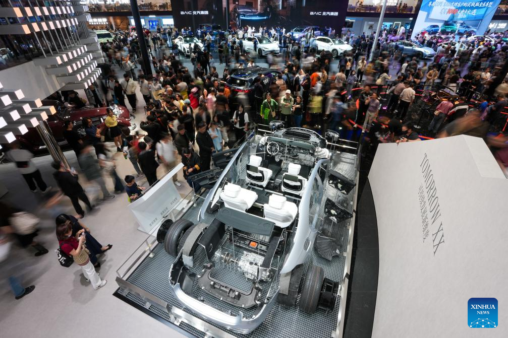 People visit the booth of Mercedes-Benz during the 2026 Beijing International Automotive Exhibition in Beijing, capital of China, April 26, 2026. The 2026 Beijing International Automotive Exhibition, which kicked off here on Friday, opens for professional visitors from April 26 to 27. The show in China's capital city has set a new global record for scale, spanning 380,000 square meters across two venues, with 1,451 vehicles on display -- 181 of them premieres and 71 concept cars. (Xinhua/Ju Huanzong)